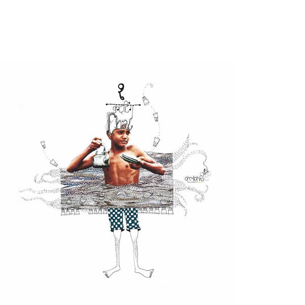 This is a mix-media graphic, almost entirely hand illustrated, with a little help from this sweet boy walking through waist deep water to serve the cutting chai.