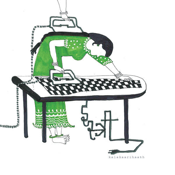 The illustration reflects through the form of an iron, locally called the ‘istri’, the still prevailing presumption of a woman taking on the responsibility of the household chores. This graphic is entirely hand illustrated.